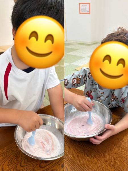 お友だちと順番を交代しながら材料を入れていき、10回数えながら混ぜて完成✨