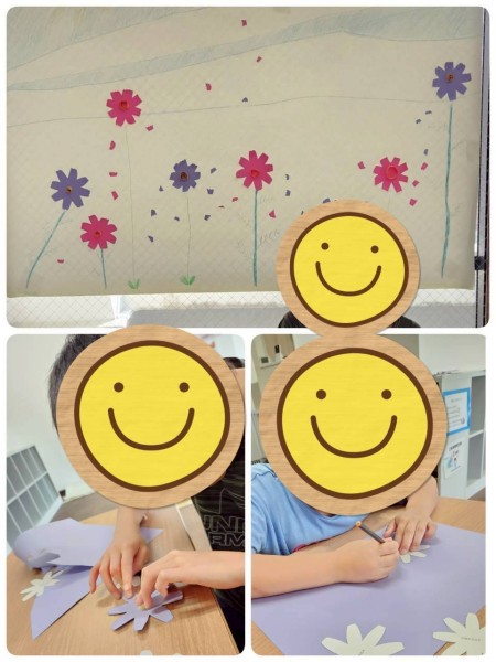 コスモスの花を切って花びらを丸くして貼っていきます😊