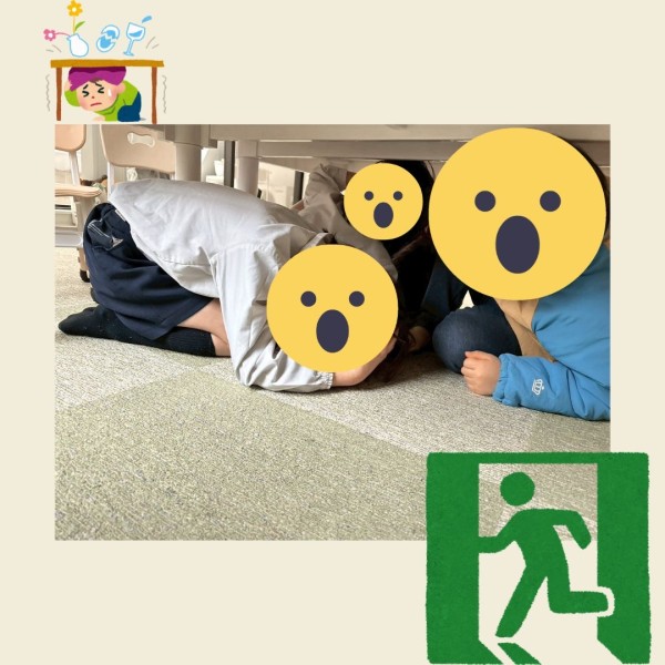 子どもたちは訓練が始まると、しっかり机の下に隠れて身を守ることができていました。
