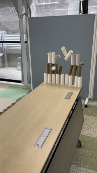 トイレットペーパーを積み上げ、的当て卓球をしたりと