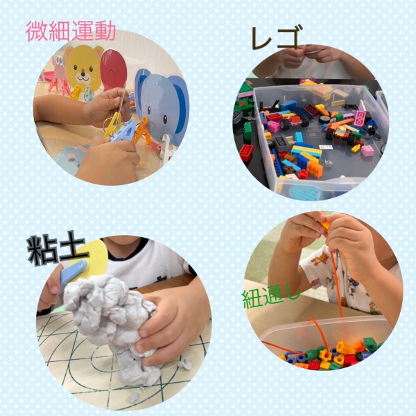粘土、紐通し、塗り絵、パズル、レゴなどに取り組み、無理なく座る練習をしています😊