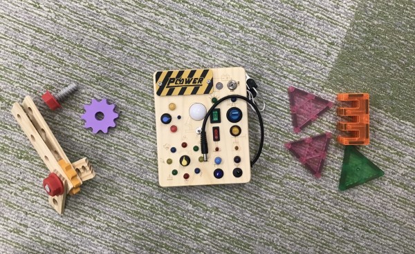 工具セットやLEDライトがピカピカ光る板、マグネットをひっつけて形作り遊びができるおもちゃ、、などなどです☀️